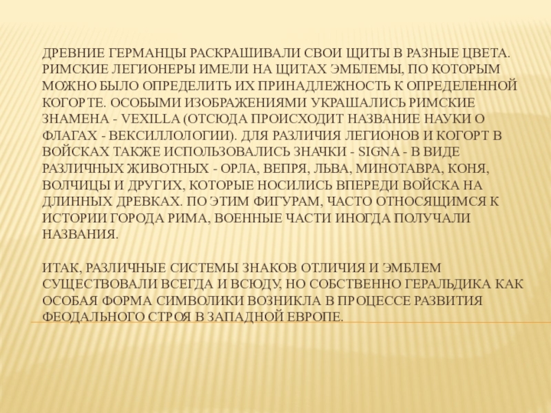 принадлежность к определенной когорте. Особыми изображениями украшались римские знамена - vexilla (отсюда происходит название науки о флагах - вексиллологии). Для различия легионов и когорт в войсках также использовались значки - signa - в виде различных животных - орла, вепря, льва, минотавра, коня, волчицы и других, которые носились впереди войска на длинных древках. По этим фигурам, часто относящимся к истории города Рима, военные части иногда получали названия. Итак, различные системы знаков отличия и эмблем существовали всегда и всюду, но собственно геральдика как особая форма символики возникла в процессе развития феодального строя в Западной Европе.