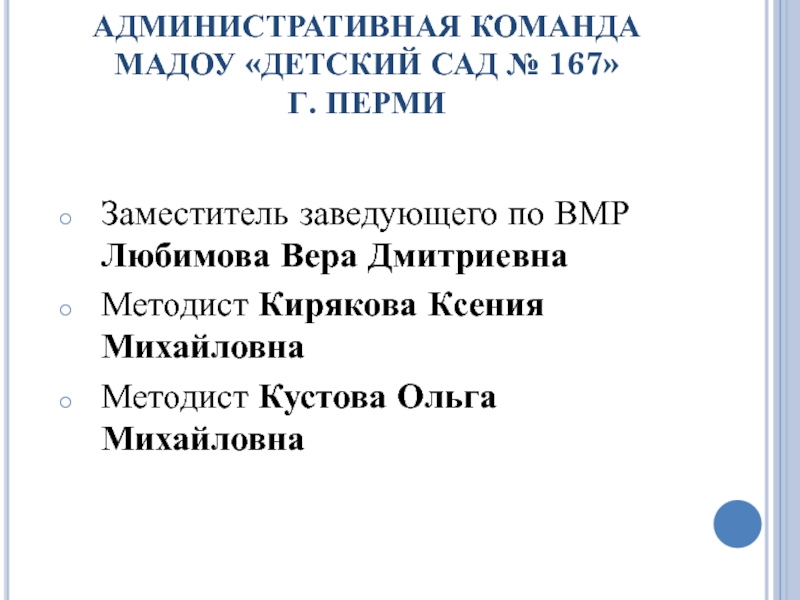 АДМИНИСТРАТИВНАЯ КОМАНДА МАДОУ «ДЕТСКИЙ САД № 167» Г. ПЕРМИ Заместитель заведующего по ВМР Любимова Вера ДмитриевнаМетодист Кирякова Ксения Михайловна Методист Кустова Ольга Михайловна