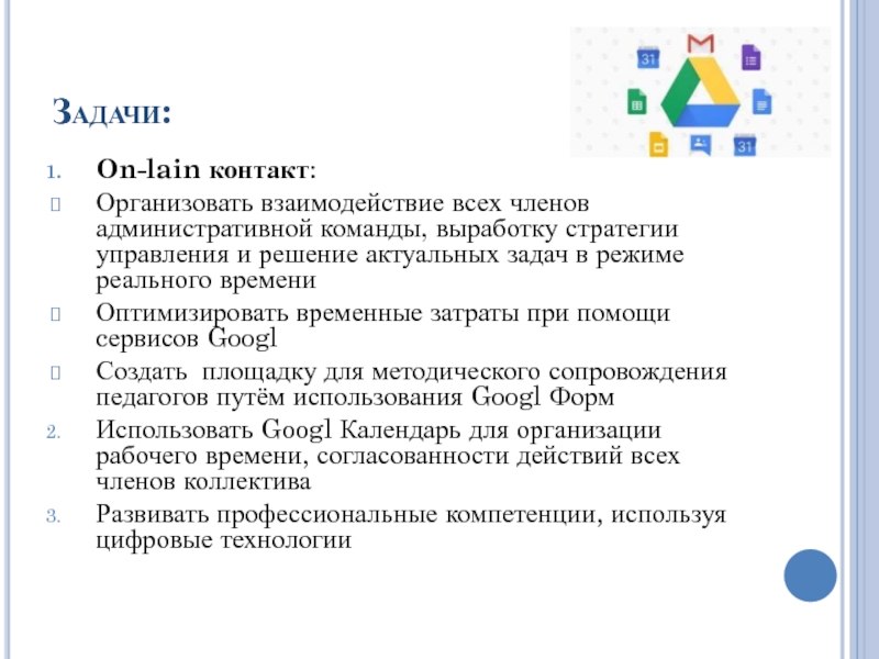 Задачи:On-lain контакт: Организовать взаимодействие всех членов административной команды, выработку стратегии управления и решение актуальных задач в режиме