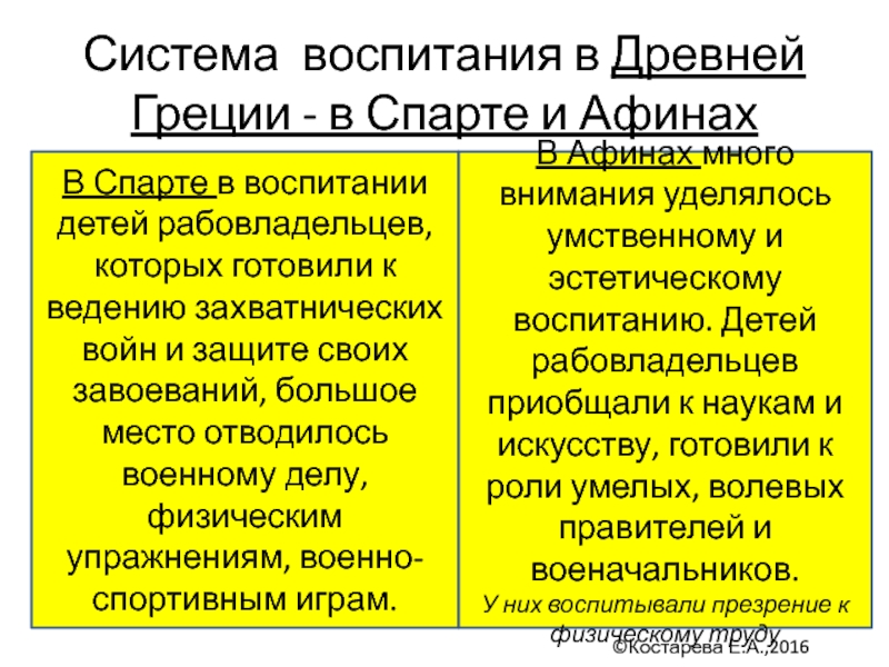 В Афинах много внимания уделялось умственному и эстетическому воспитанию. Детей рабовладельцев приобщали к наукам и искусству, готовили к роли умелых, волевых правителей и военачальников.