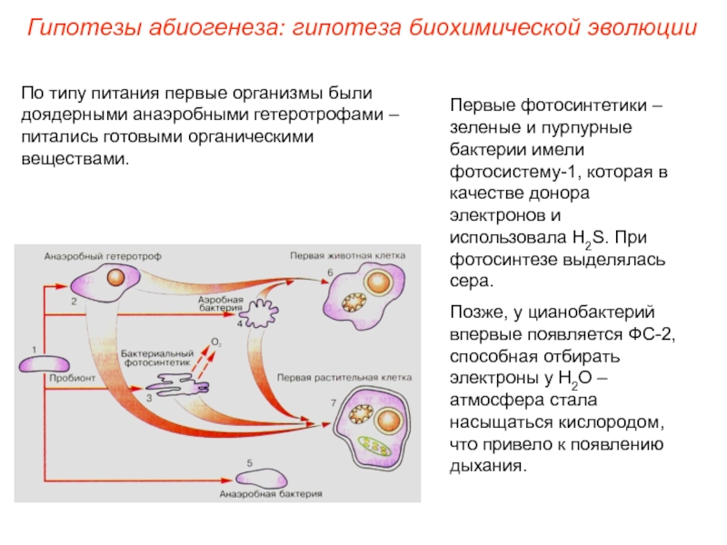 По типу питания первые организмы были доядерными анаэробными гетеротрофами – питались готовыми органическими веществами.