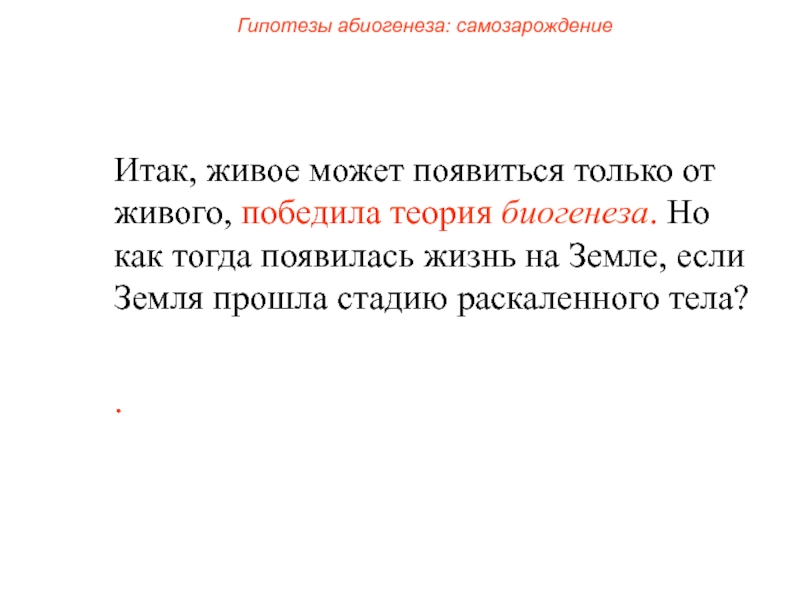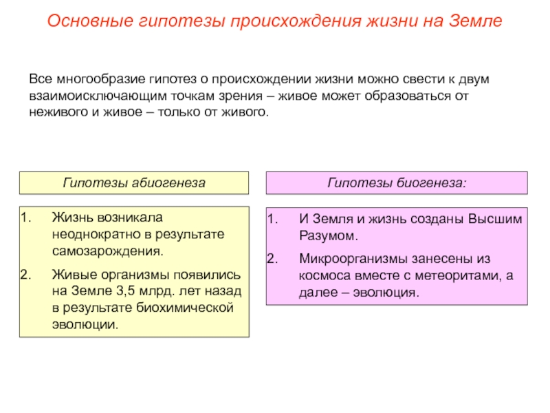 Все многообразие гипотез о происхождении жизни можно свести к двум взаимоисключающим точкам зрения – живое может образоваться от неживого и живое – только от живого.