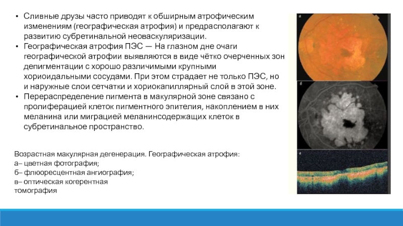 Слайд 11Сливные друзы часто приводят к обширным атрофическим изменениям (географическая атрофия)