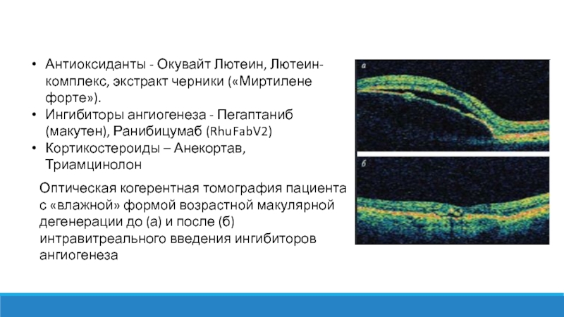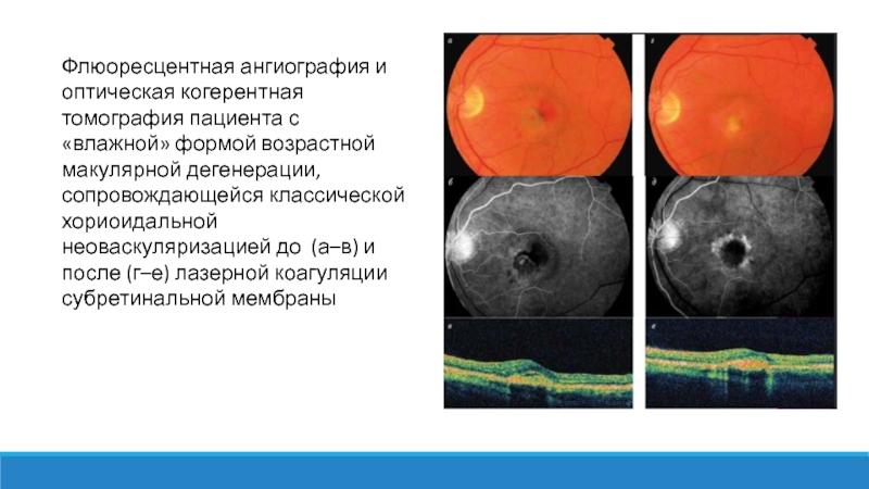 Слайд 15Флюоресцентная ангиография и оптическая когерентная томография пациента с «влажной» формой