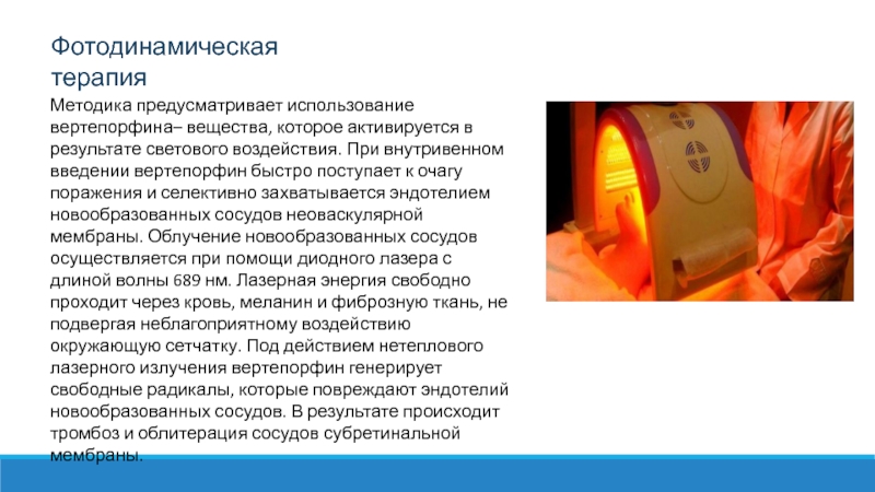 поражения и селективно захватывается эндотелием новообразованных сосудов неоваскулярной мембраны. Облучение новообразованных сосудов осуществляется при помощи диодного лазера с длиной волны 689 нм. Лазерная энергия свободно проходит через кровь, меланин и фиброзную ткань, не подвергая неблагоприятному воздействию окружающую сетчатку. Под действием нетеплового лазерного излучения вертепорфин генерирует свободные радикалы, которые повреждают эндотелий новообразованных сосудов. В результате происходит тромбоз и облитерация сосудов субретинальной мембраны.