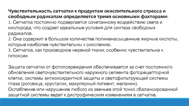 Слайд 5Чувствительность сетчатки к продуктам окислительного стресса и свободным радикалам определяется