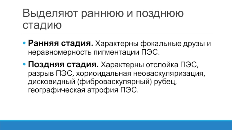 Поздняя стадия. Характерны отслойка ПЭС, разрыв ПЭС, хориоидальная
