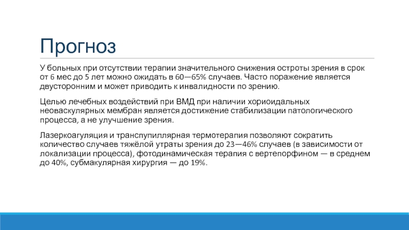 Целью лечебных воздействий при ВМД при наличии хориоидальных неоваскулярных мембран является достижение стабилизации патологического процесса, а не улучшение зрения.