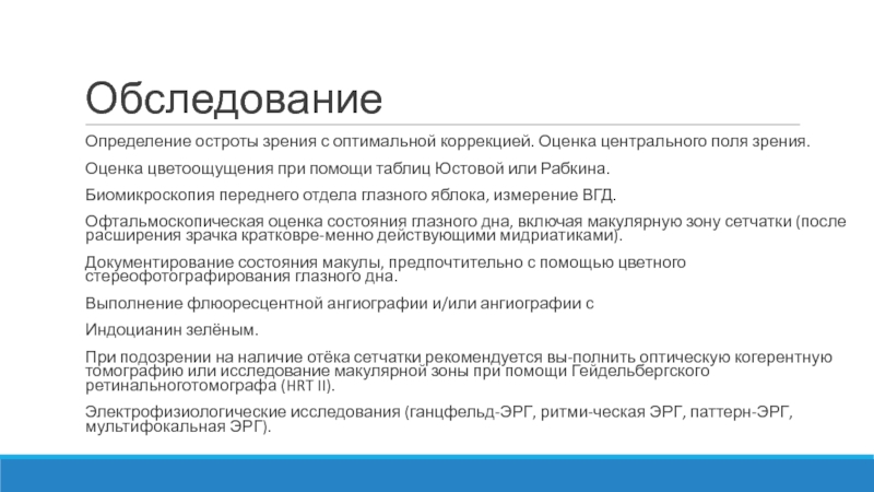 При подозрении на наличие отёка сетчатки рекомендуется вы-полнить оптическую когерентную томографию или исследование макулярной зоны при помощи Гейдельбергского ретинальноготомографа (HRT II).