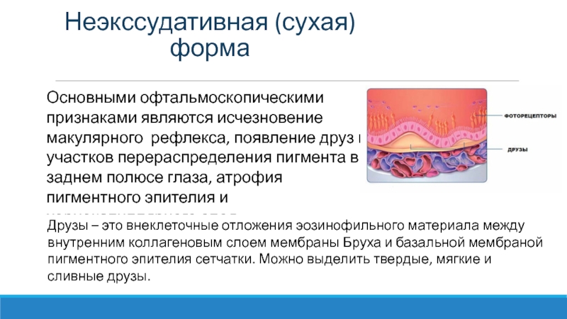 Неэкссудативная (сухая) форма: ретинальные друзы, дефекты пигментного эпителия, перераспределение пигмента, атрофия пигментного эпителия и хориокапиллярного слоя.