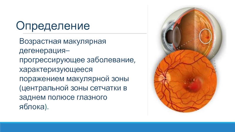 Возрастная макулярная дегенерация– прогрессирующее заболевание, характеризующееся поражением макулярной зоны (центральной