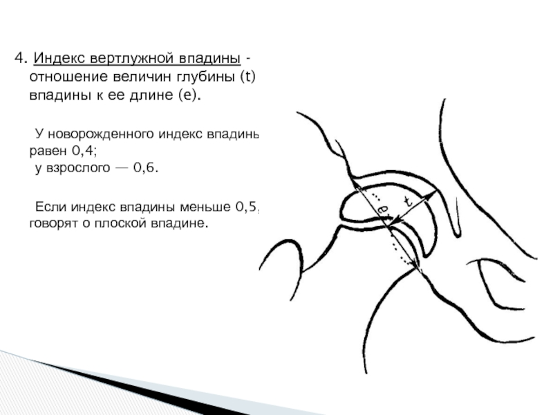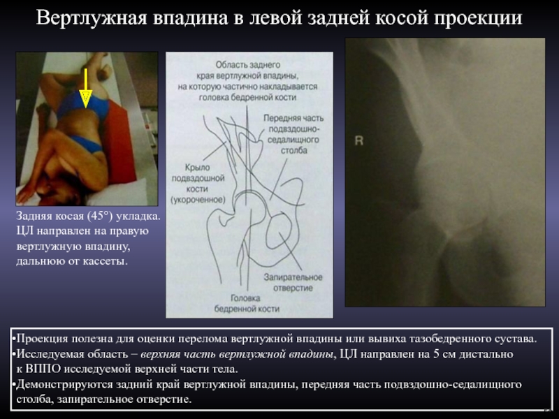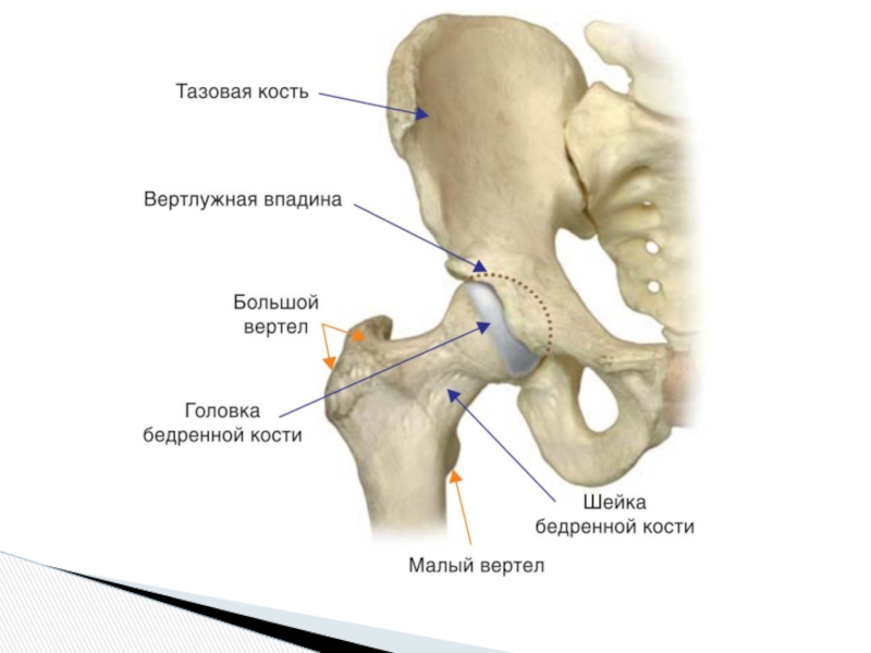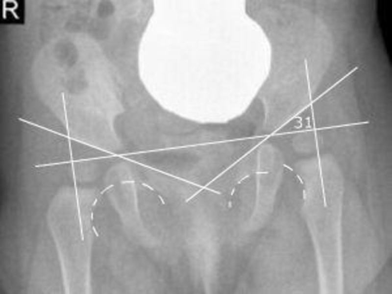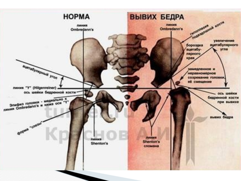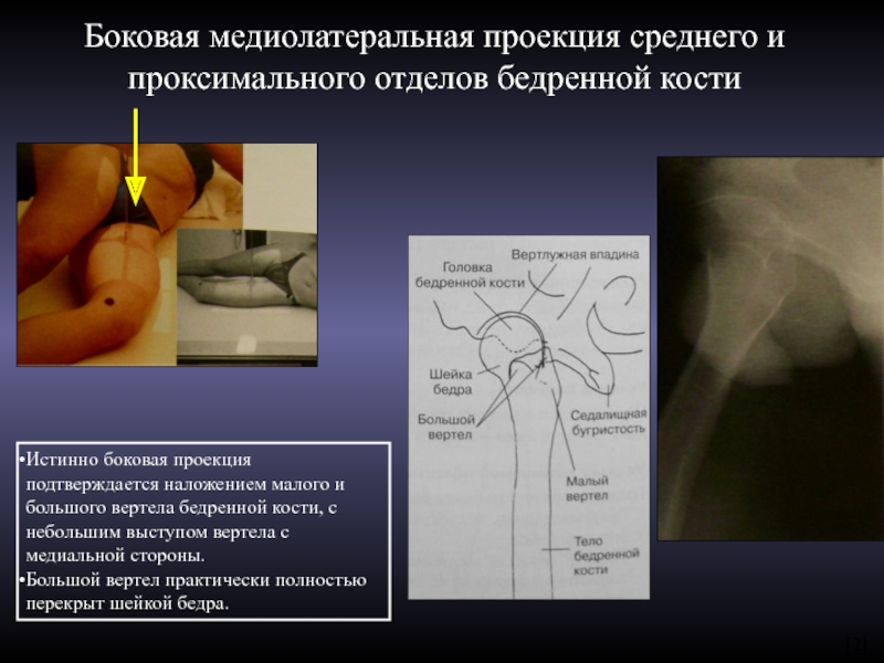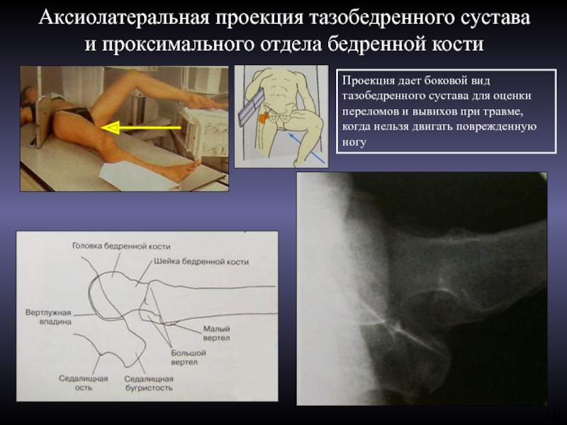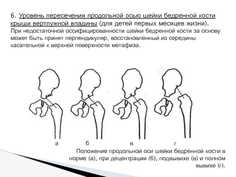 латеральный край бедра и не должен на него накладываться. Шейка бедренной кости (2) выглядит не укороченной.