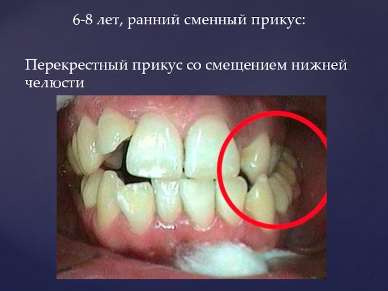 6-8 лет, ранний сменный прикус:Перекрестный прикус со смещением нижней челюсти