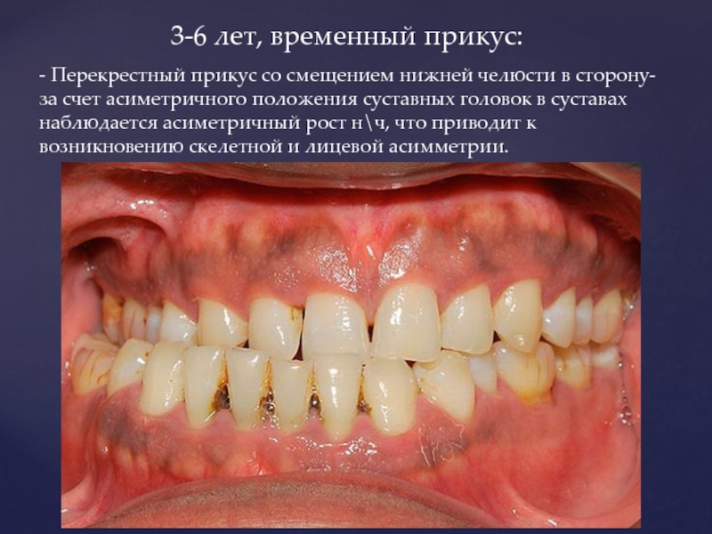 3-6 лет, временный прикус:- Перекрестный прикус со смещением нижней челюсти в сторону- за счет асиметричного положения суставных