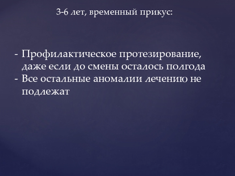 3-6 лет, временный прикус:Профилактическое протезирование, даже если до смены осталось полгодаВсе остальные аномалии лечению не подлежат