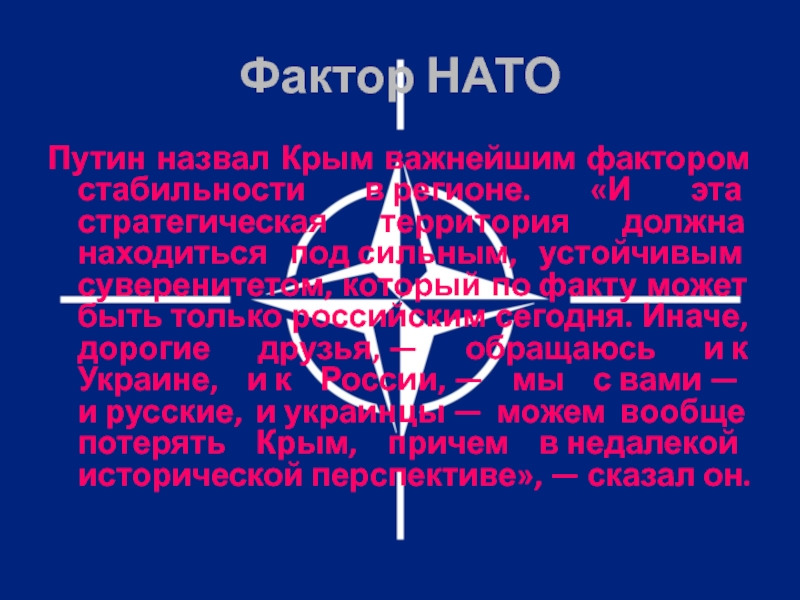 мы против того, чтобы военная организация хозяйничала возле нашего забора, рядом с нашим домом или на наших исторических территориях. Вы знаете, я просто не могу себе представить, что мы будем ездить в Севастополь в гости к натовским морякам… Лучше пускай они к нам приезжают в гости в Севастополь, чем мы к ним», — отметил президент.