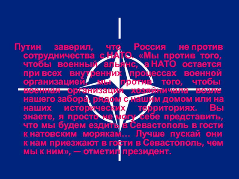 Слайд 19Путин заверил, что Россия не против сотрудничества с НАТО. «Мы против того,