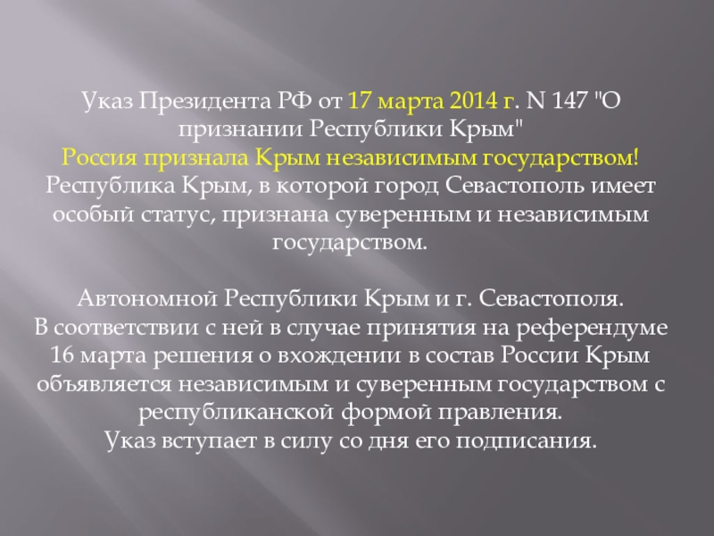 Слайд 13 Указ Президента РФ от 17 марта 2014 г. N 147