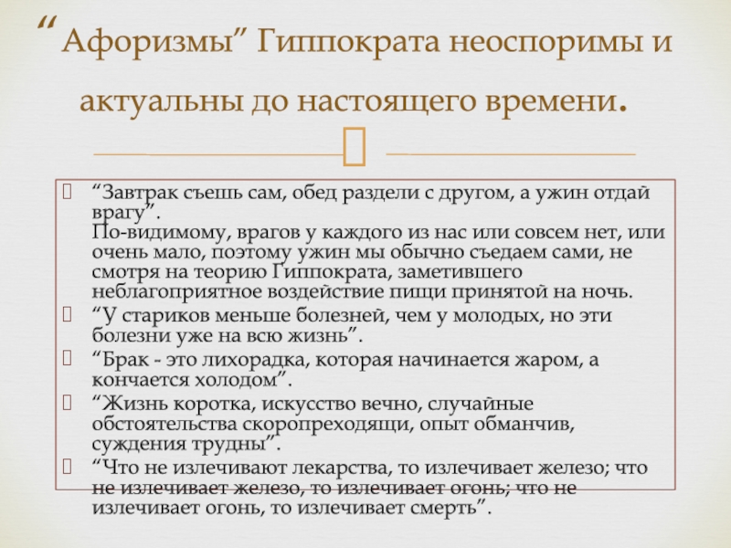 “Афоризмы” Гиппократа неоспоримы и актуальны до настоящего времени.