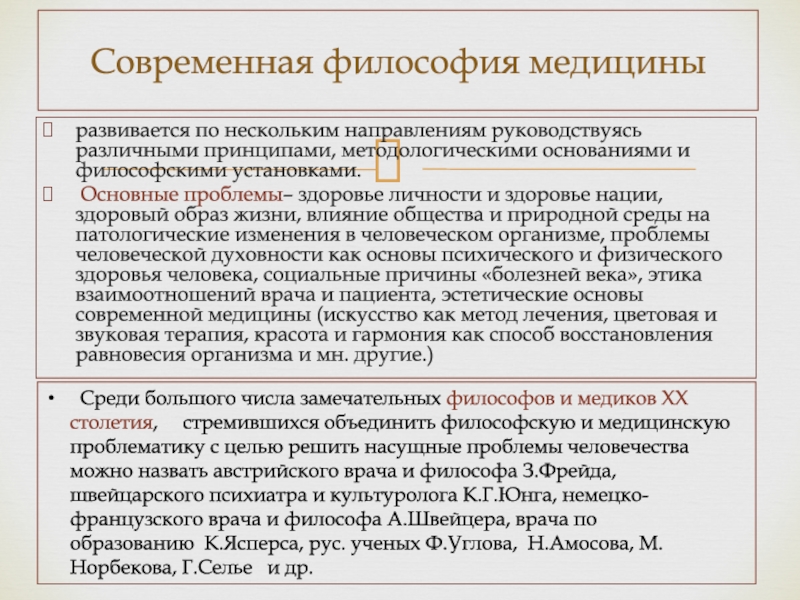 Среди большого числа замечательных философов и медиков ХХ столетия, стремившихся объединить философскую и медицинскую проблематику с целью решить насущные проблемы человечества можно назвать австрийского врача и философа З.Фрейда, швейцарского психиатра и культуролога К.Г.Юнга, немецко-французского врача и философа А.Швейцера, врача по образованию К.Ясперса, рус. ученых Ф.Углова, Н.Амосова, М.Норбекова, Г.Селье и др.