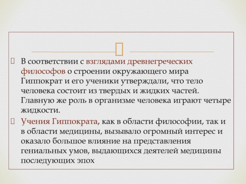 Задачу врача Гиппократ видел в изучении индивидуальных особенностей больного, в обеспечении мобилизации сил организма для восстановления здоровья. В медицинской этике Гиппократ, выдвинул четыре принципа лечения: не вредить больному; противоположное лечить противоположным; помогать природе; щадить больного. Гиппократ установил стадии развития болезней, заложил основы античной хирургии, разработал способы применения повязок, лечения переломов и вывихов, ввел в медицину понятия анамнеза, прогноза, этиологии; разделил людей по темпераментам (сангвиники, холерики, флегматики, меланхолики).