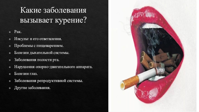 Какие заболевания вызывает курение?Рак.Инсульт и его ответвления.Проблемы с пищеварением. Болезни дыхательной системы.Заболевания полости рта. Нарушения опорно-двигательного аппарата. Болезни глаз.Заболевания