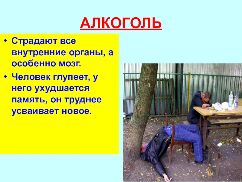 АЛКОГОЛЬСтрадают все внутренние органы, а особенно мозг.Человек глупеет, у него ухудшается память, он труднее усваивает новое.