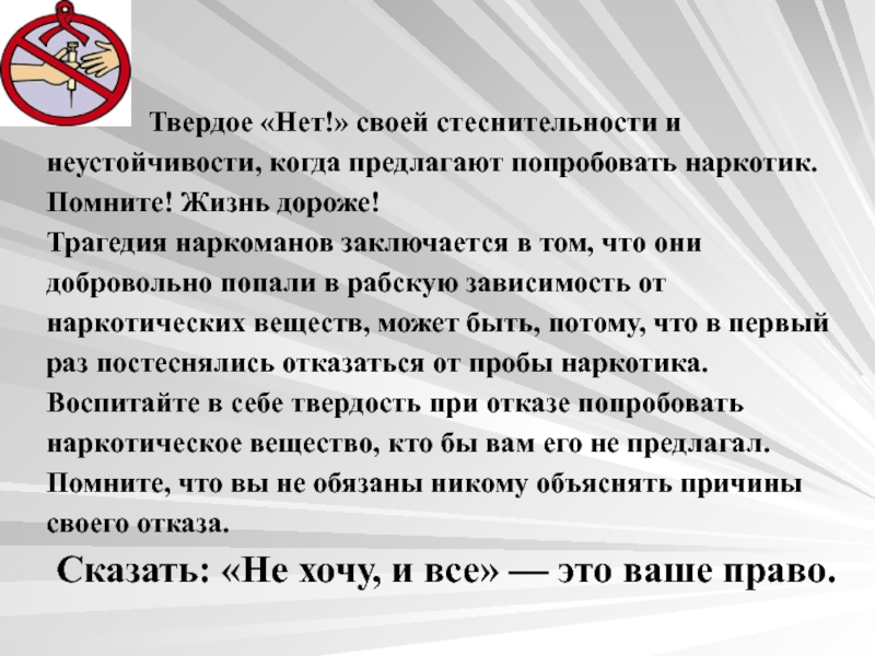 У вас должна быть сформирована твердая установка: «Всегда только „Нет!" любым наркотикам. Только „Нет!"» — это ваша надежная защита.
