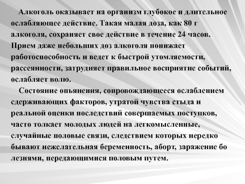 Слайд 9 Алкоголь оказывает на организм глубокое и длительное ослабляющее