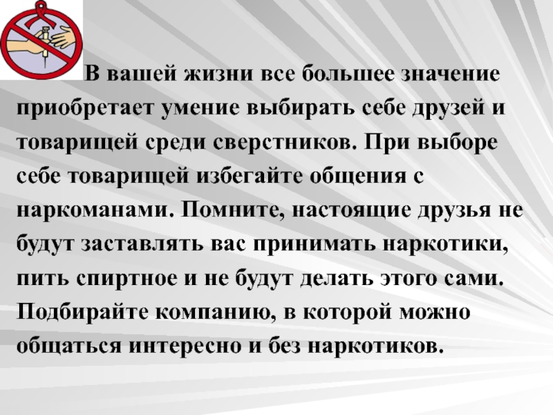 сверстников. При выборе себе товарищей избегайте общения с наркоманами. Помните, настоящие друзья не будут заставлять вас принимать наркотики, пить спиртное и не будут делать этого сами. Подбирайте компанию, в которой можно общаться интересно и без наркотиков.
