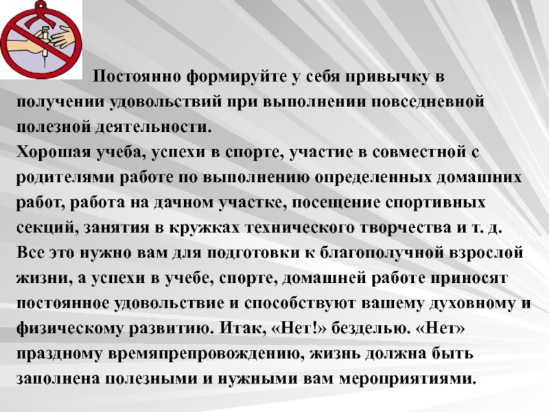 Хорошая учеба, успехи в спорте, участие в совместной с родителями работе по выполнению определенных домашних работ, работа на дачном участке, посещение спортивных секций, занятия в кружках технического творчества и т. д. Все это нужно вам для подготовки к благополучной взрослой жизни, а успехи в учебе, спорте, домашней работе приносят постоянное удовольствие и способствуют вашему духовному и физическому развитию. Итак, «Нет!» безделью. «Нет» праздному времяпрепровождению, жизнь должна быть заполнена полезными и нужными вам мероприятиями.