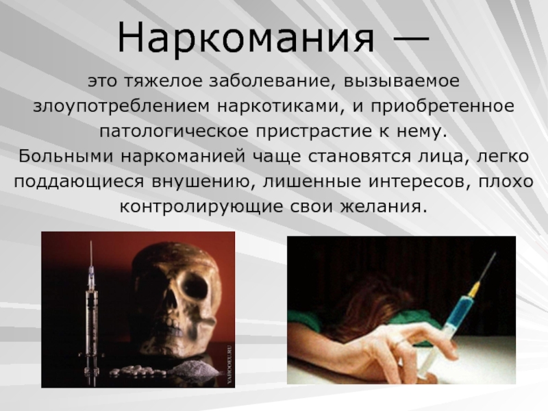 наркоманов заключается в том, что они добровольно попали в рабскую зависимость от наркотических веществ, может быть, потому, что в первый раз постеснялись отказаться от пробы наркотика.