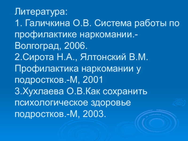 Литература: 1. Галичкина О.В. Система работы по профилактике наркомании.-Волгоград, 2006. 2.Сирота Н.А., Ялтонский В.М.Профилактика наркомании у подростков.-М,