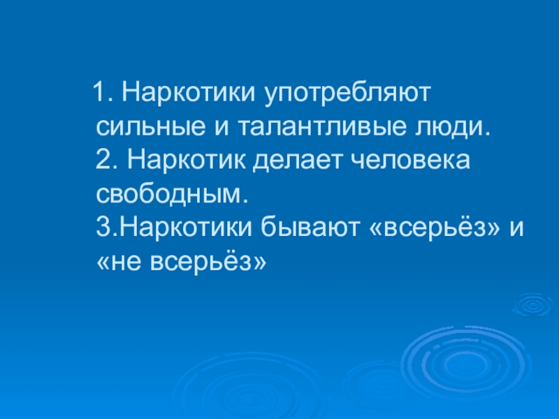 1. Наркотики употребляют сильные и талантливые люди. 2. Наркотик делает человека свободным. 3.Наркотики бывают