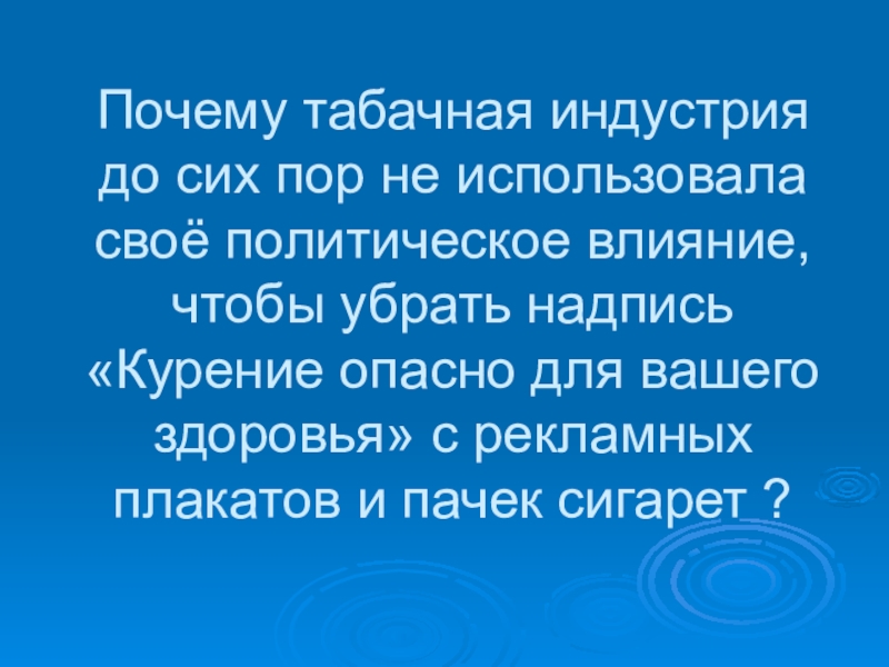 Слайд 7Почему табачная индустрия до сих пор не использовала своё политическое