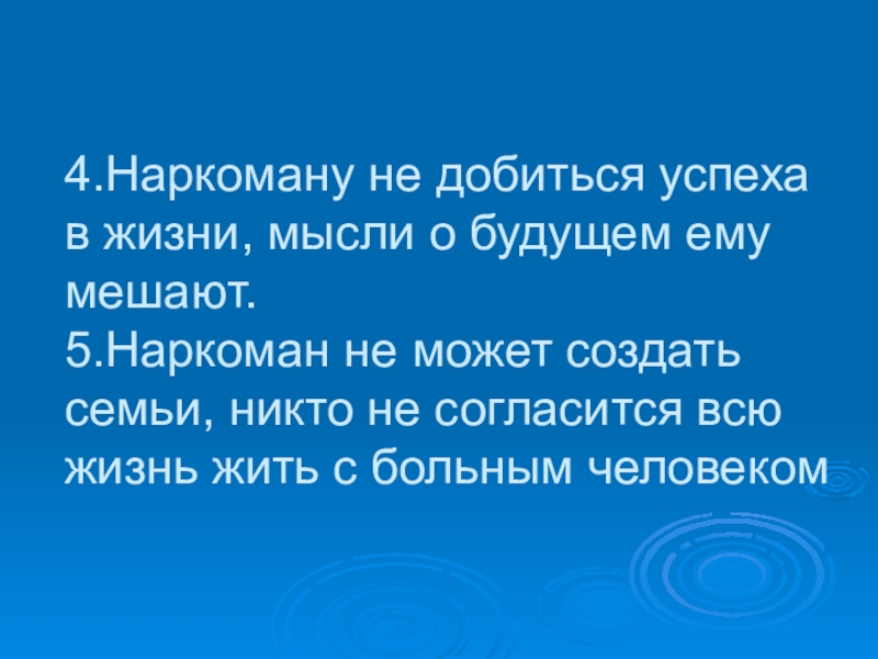 4.Наркоману не добиться успеха в жизни, мысли о будущем ему мешают. 5.Наркоман не может создать семьи, никто