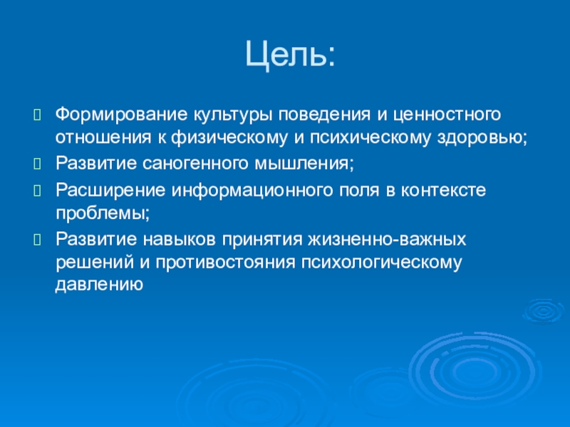 Цель:Формирование культуры поведения и ценностного отношения к физическому и психическому здоровью;Развитие саногенного мышления;Расширение информационного поля в контексте проблемы;Развитие навыков принятия жизненно-важных решений и противостояния психологическому давлению