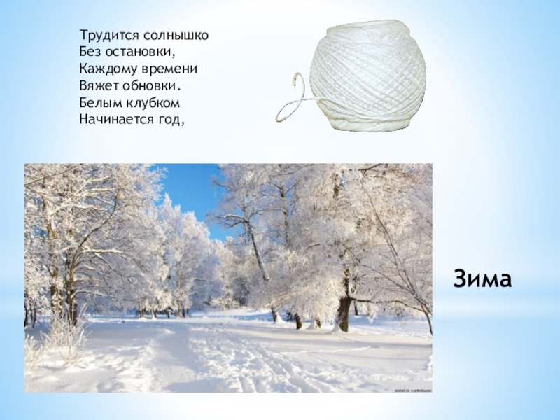 Трудится солнышко Без остановки, Каждому времени Вяжет обновки. Белым клубком Начинается год, Зима