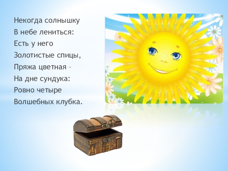 Некогда солнышку В небе лениться: Есть у него Золотистые спицы, Пряжа цветная – На дне сундука: Ровно четыре Волшебных клубка.