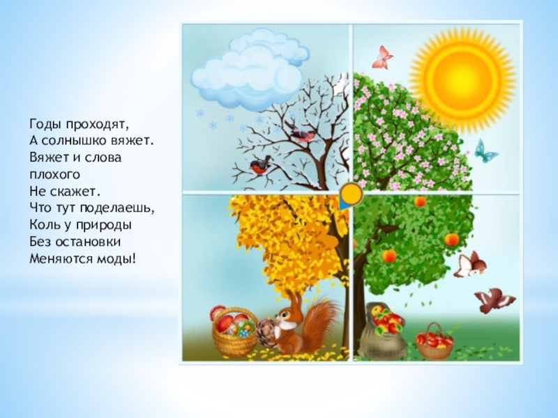 Годы проходят, А солнышко вяжет. Вяжет и слова плохого Не скажет. Что тут поделаешь, Коль у природы