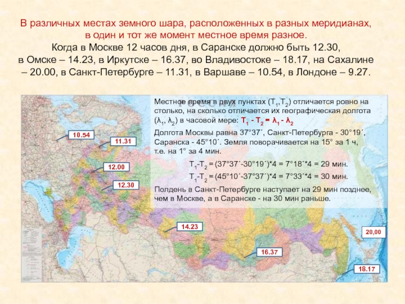 Долгота Москвы равна 37°37´, Санкт-Петербурга - 30°19´, Саранска - 45°10´. Земля поворачивается на 15° за 1 ч, т.е. на 1° за 4 мин.