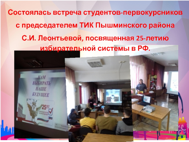 Состоялась встреча студентов-первокурсниковс председателем ТИК Пышминского района С.И. Леонтьевой, посвященная 25-летию избирательной системы в РФ.