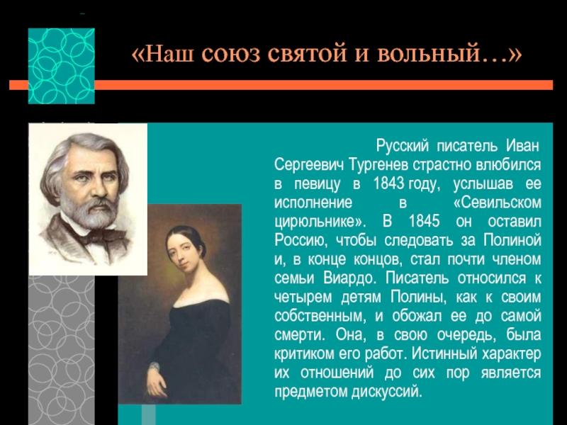 в 1843 году, услышав ее исполнение в «Севильском цирюльнике». В 1845 он оставил Россию, чтобы следовать за Полиной и, в конце концов, стал почти членом семьи Виардо. Писатель относился к четырем детям Полины, как к своим собственным, и обожал ее до самой смерти. Она, в свою очередь, была критиком его работ. Истинный характер их отношений до сих пор является предметом дискуссий.