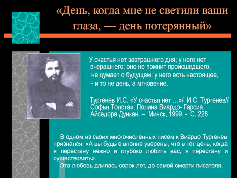 Тургенев И.С. «У счастья нет …»/ И.С. Тургенев// Софья Толстая. Полина Виардо- Гарсиа. Айседора Дункан. – Минск, 1999. - С. 228