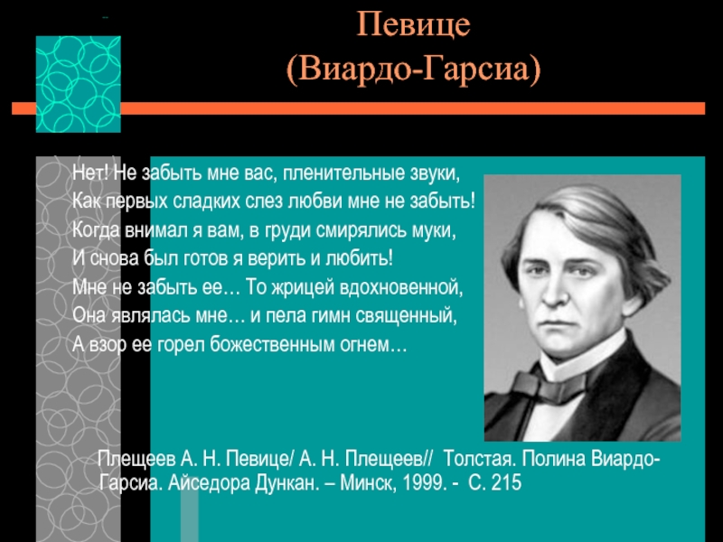 Плещеев А. Н. Певице/ А. Н. Плещеев// Толстая. Полина Виардо-Гарсиа. Айседора Дункан. – Минск, 1999. - С. 215