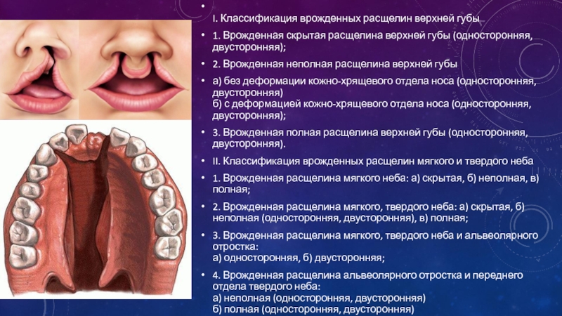 I. Классификация врожденных расщелин верхней губы1. Врожденная скрытая расщелина верхней губы (односторонняя, двусторонняя);2. Врожденная неполная расщелина верхней губыа) без деформации кожно-хрящевого отдела носа (односторонняя, двусторонняя) б) с деформацией кожно-хрящевого отдела