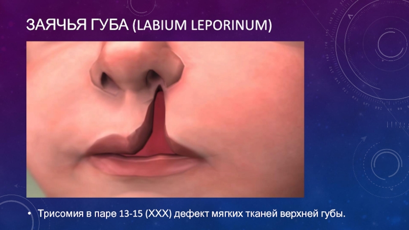 Заячья губа (labium leporinum) Трисомия в паре 13-15 (ХХХ) дефект мягких тканей верхней губы.