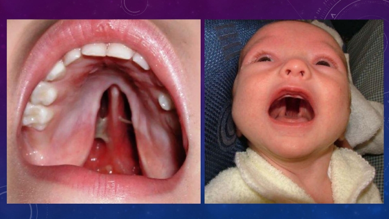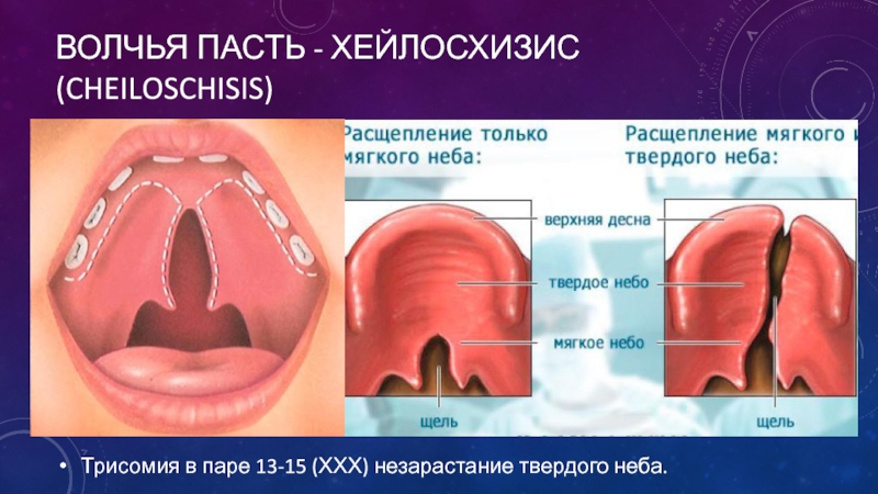 Волчья пасть - хейлосхизис (cheiloschisis) Трисомия в паре 13-15 (ХХХ) незарастание твердого неба.