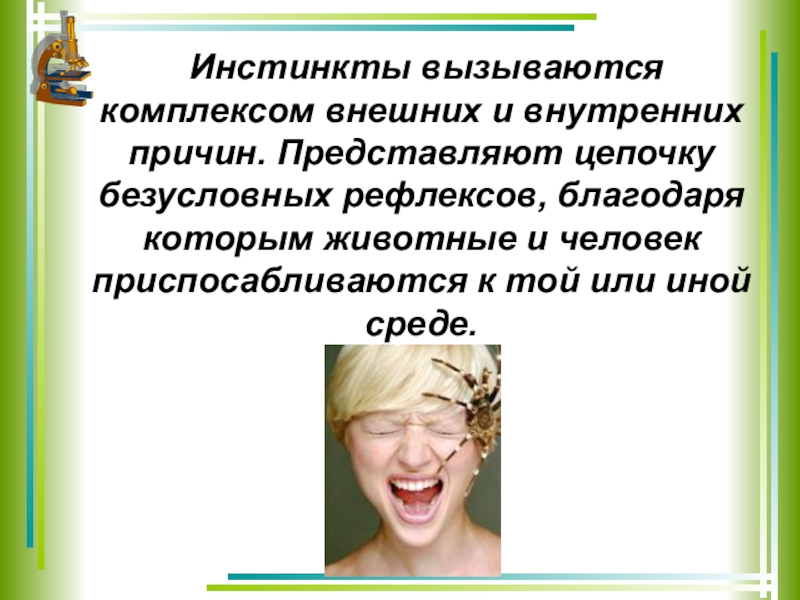 Слайд 6 Инстинкты вызываются комплексом внешних и внутренних причин. Представляют цепочку безусловных