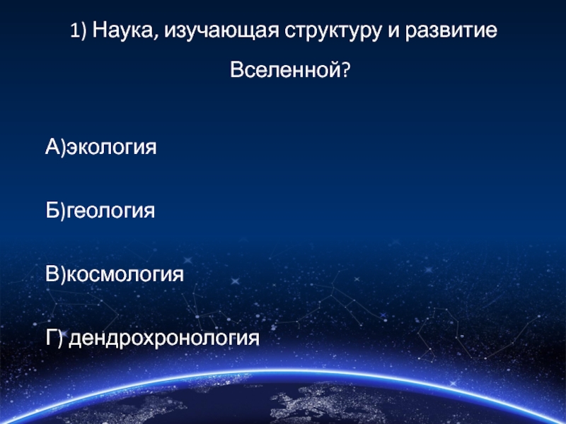 Слайд 31) Наука, изучающая структуру и развитие Вселенной?